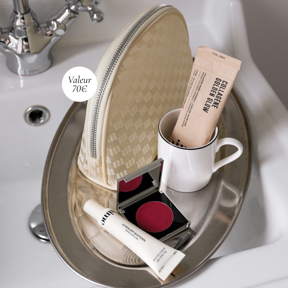 À l'intérieur : vos essentiels à emporter partout : La crème bonne mine, un stick Collagène Golden Glow et Le soin SPF quotidien en format voyage. Quantités (très) limitées !
