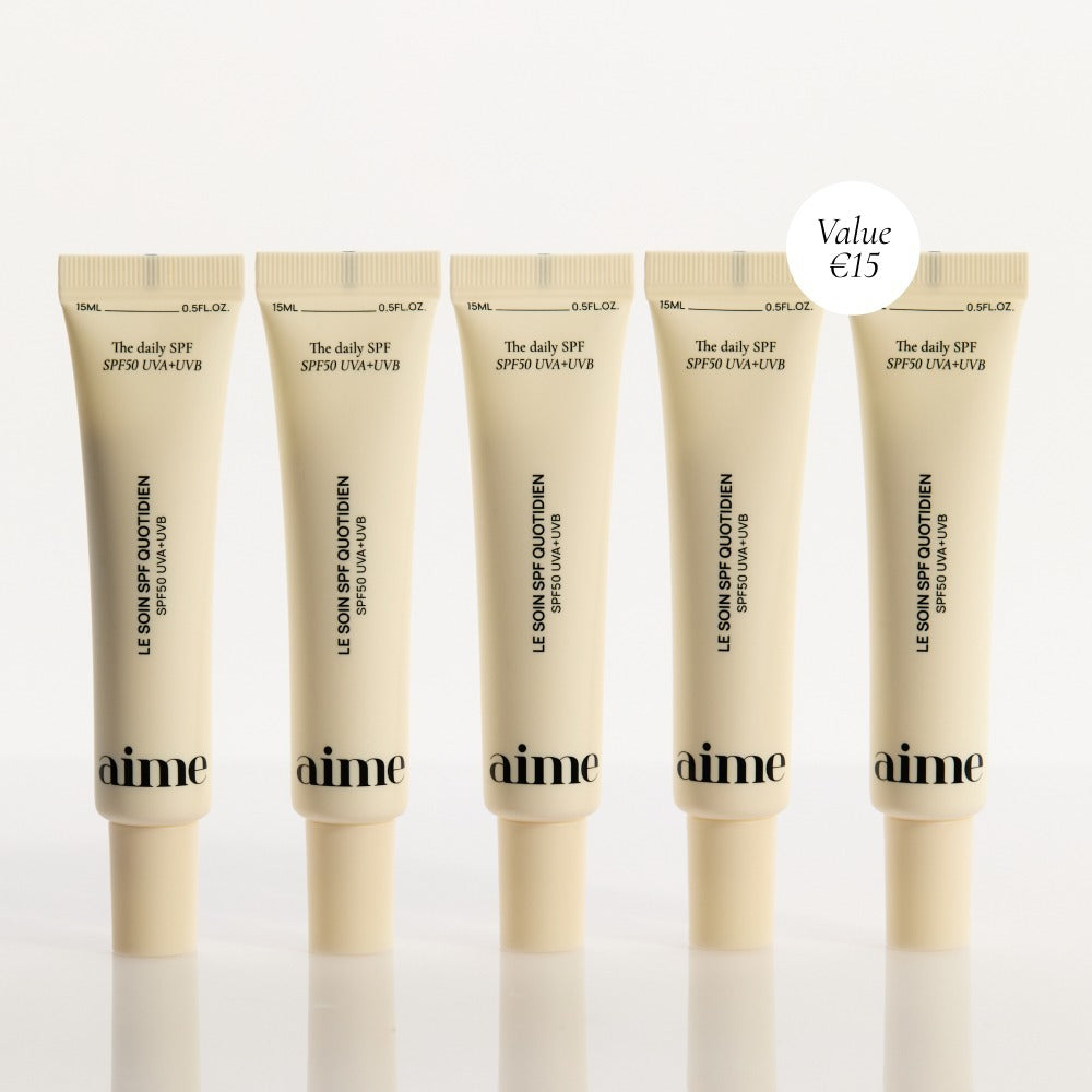 Offer valid on purchases over €85 from 14/04/2026 to 30/04/2026, while stocks last, on www.aime.co and in Aime stores, with code SPF.